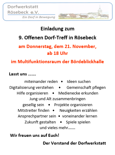 Die Dorfwerkstatt bietet das nächste offenen Treffen, am Donnerstag, dem 21. November, an. Beginn ist um 18 Uhr im Multifunktionsraum der Bördeblickhalle. In geselliger Runde wird zum Klönen und allgemeinen Austausch eingeladen. Neben der Nutzung der Lern- und Medienecke werden auch Fragen bezüglich des Lernangebotes der sogenannten Dorf-Digital-Experten aus dem Projekt Smart Country Side geklärt. Alle Rösebecker*innen sind herzlich willkommen.